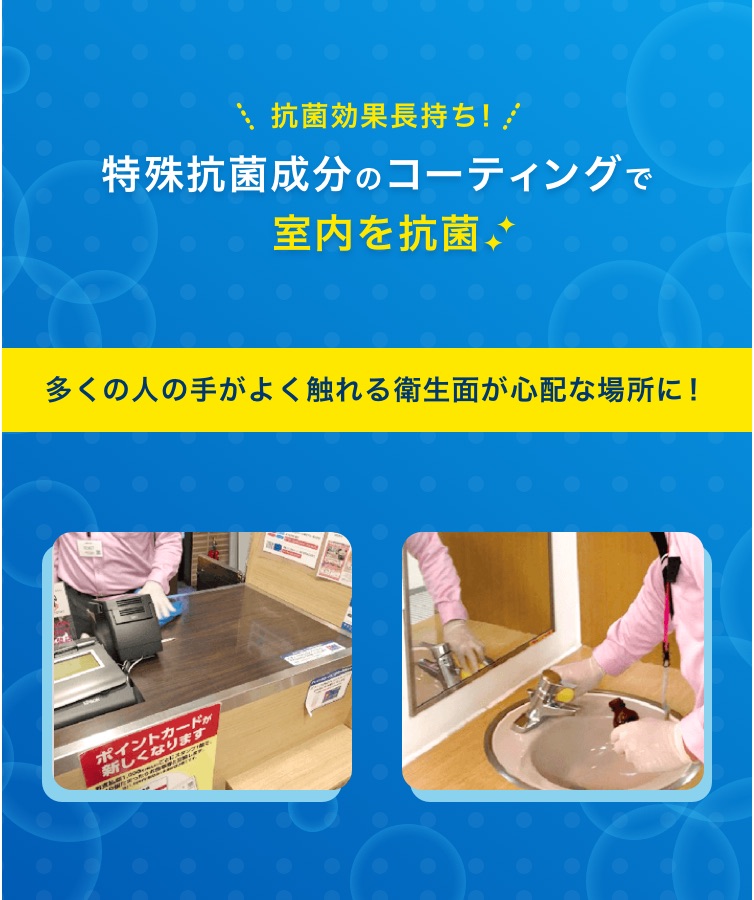 コーティング剤に含まれる特殊抗菌成分が菌の繁殖を抑制し、抗菌効果を発揮します。
